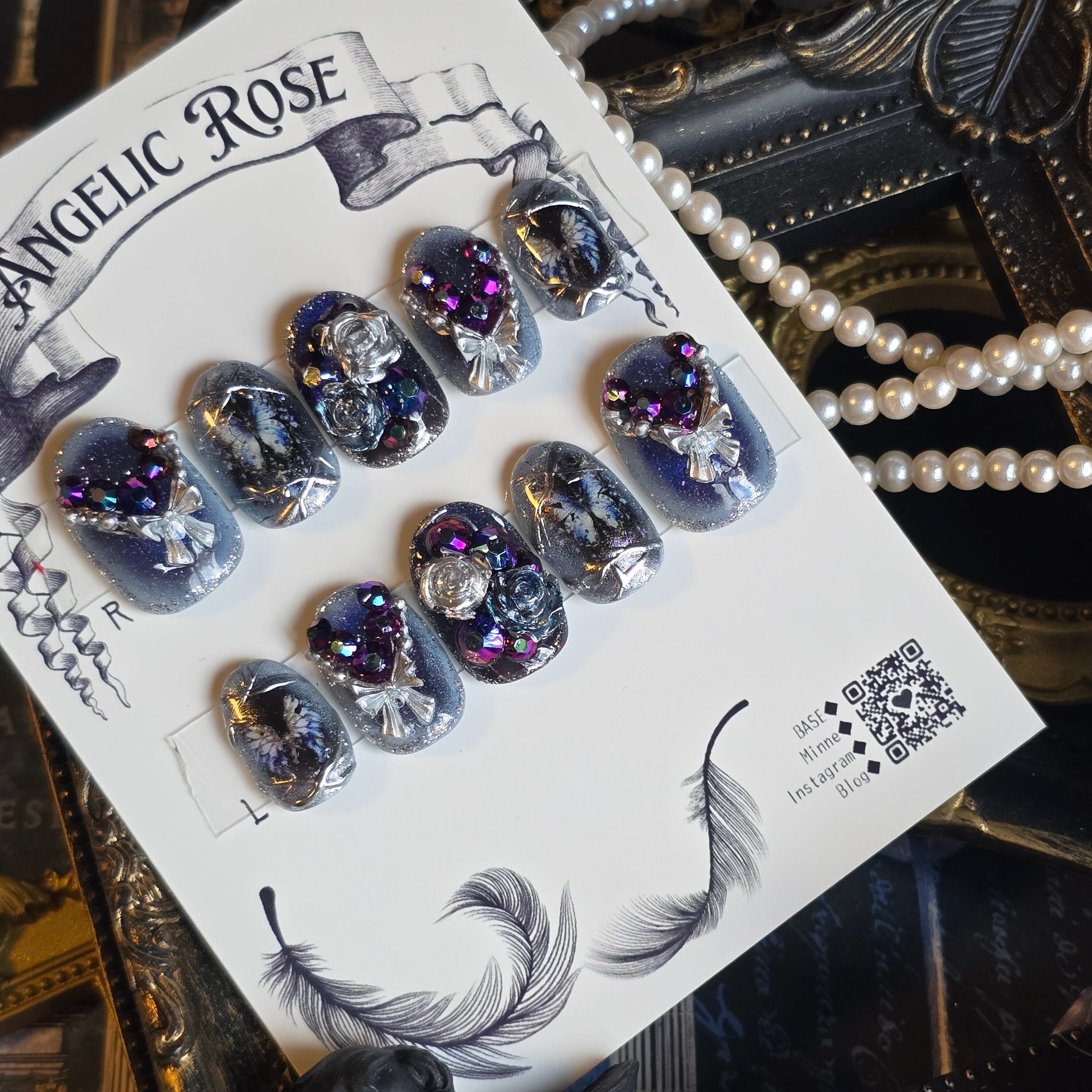 《即納》蒼月の夜、蝶は夢を視る【クラシカル・バロックのアートネイルチップ/ゴシックネイル 】Mサイズ【Angelic Rose】