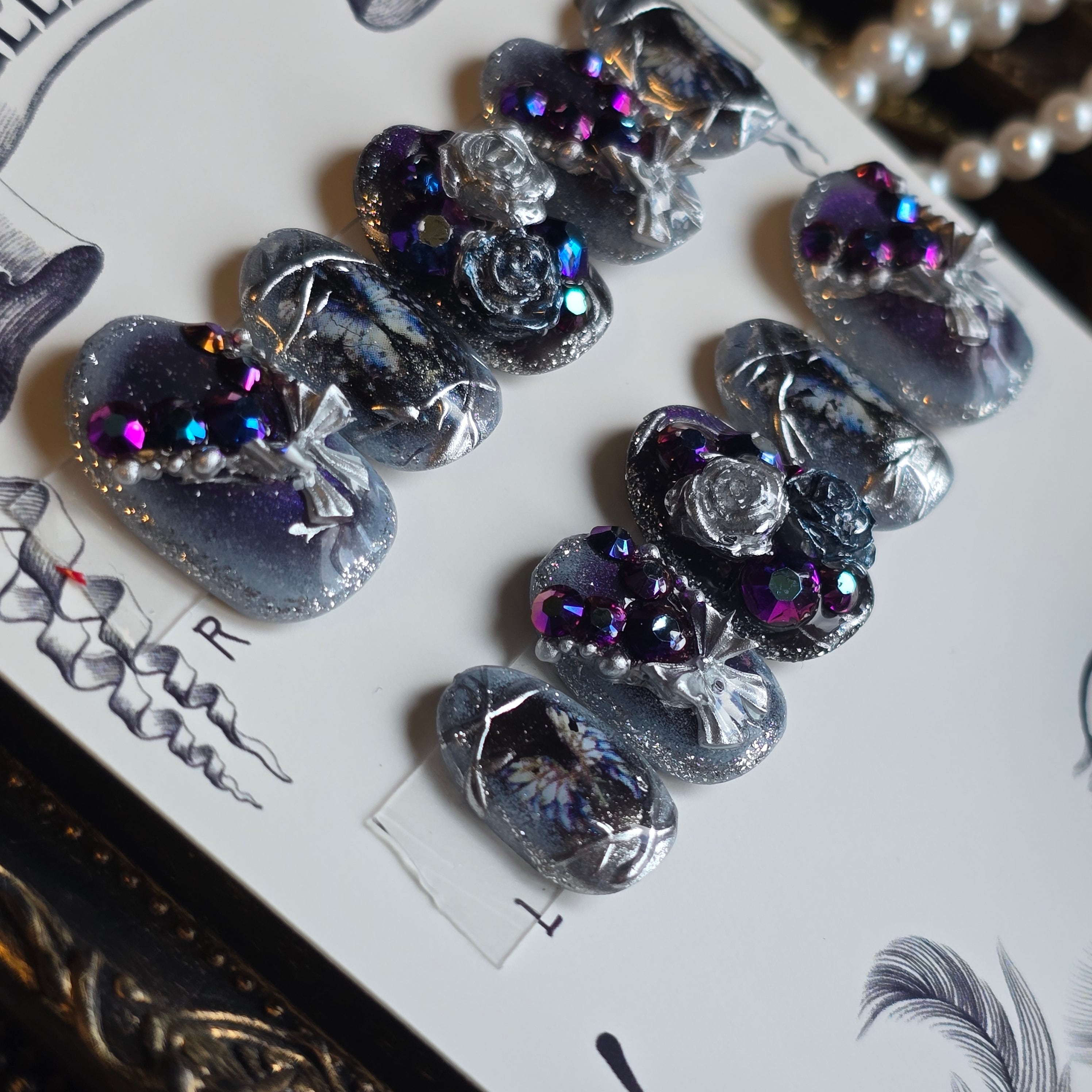 ◆色彩のコントラストが生む「毒」 ベースのダークトーンを背景に、鮮やかに主張するのは深紫のビジュー。この色彩の組み合わせは、V系やゴシックファッションを愛する貴女にとって、特別な意味を持つ「毒気」と「高貴」を表現しています。指先を動かすたびに、ラメとストーンが複雑に光を反射し、周囲の視線を釘付けにします。