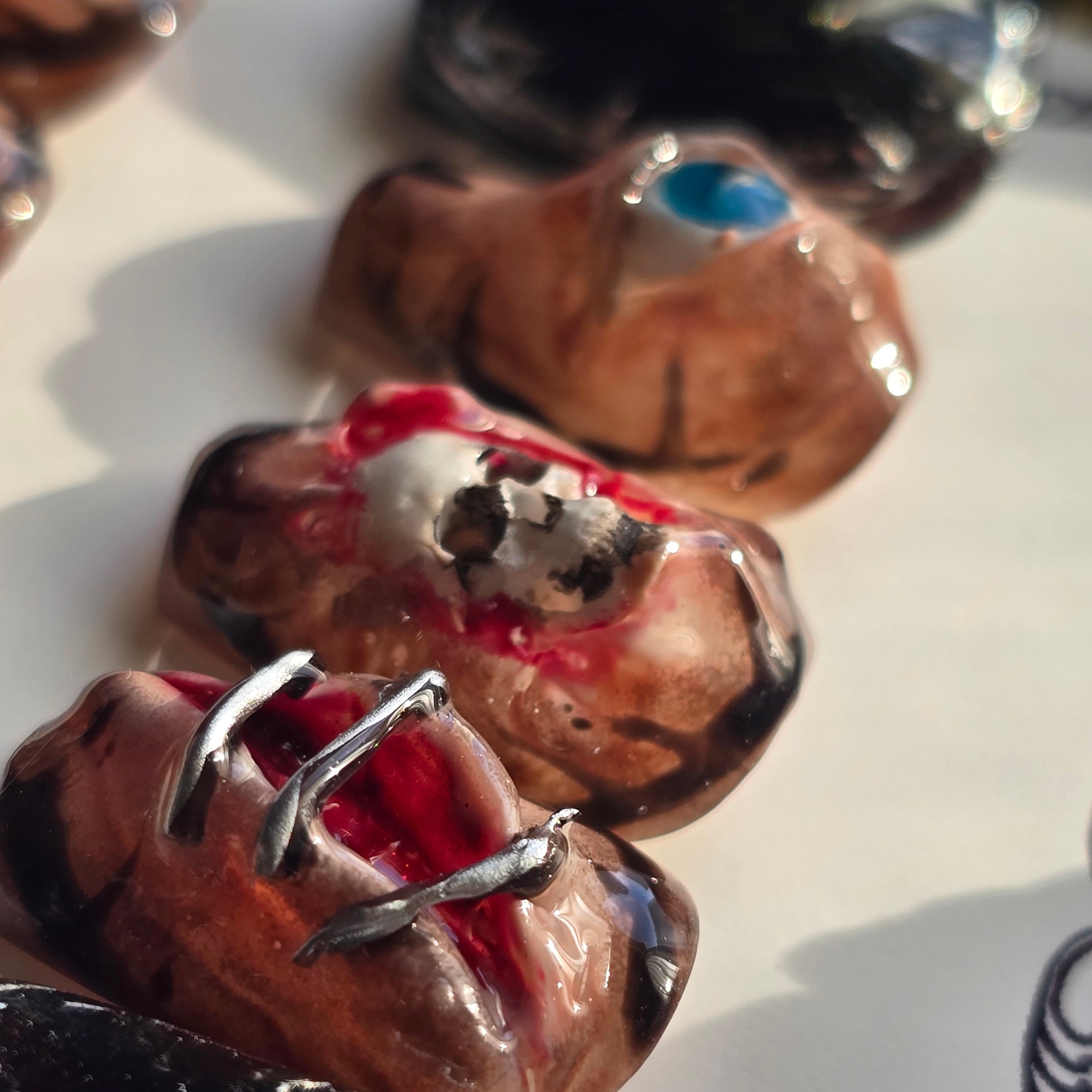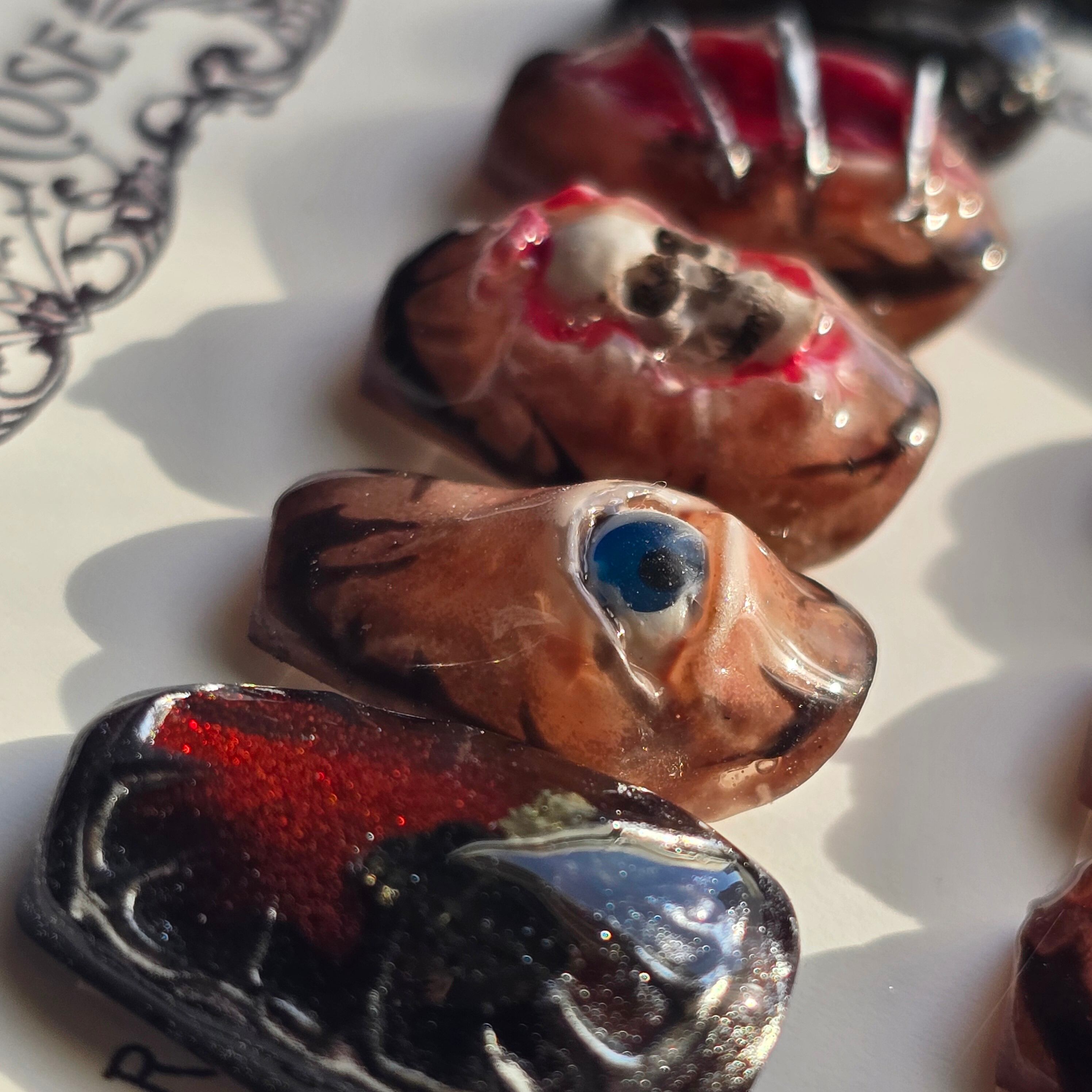 このチップの核心は、圧倒的なまでのリアリティです。見つめる青い眼球。 潤んだような質感の瞳は、持ち主の行動を監視するかのような生命力を宿しています。裂かれた肉傷口には鋭い金属で縫い留められ、そこから覗く鮮血を思わせる赤が眩しく。