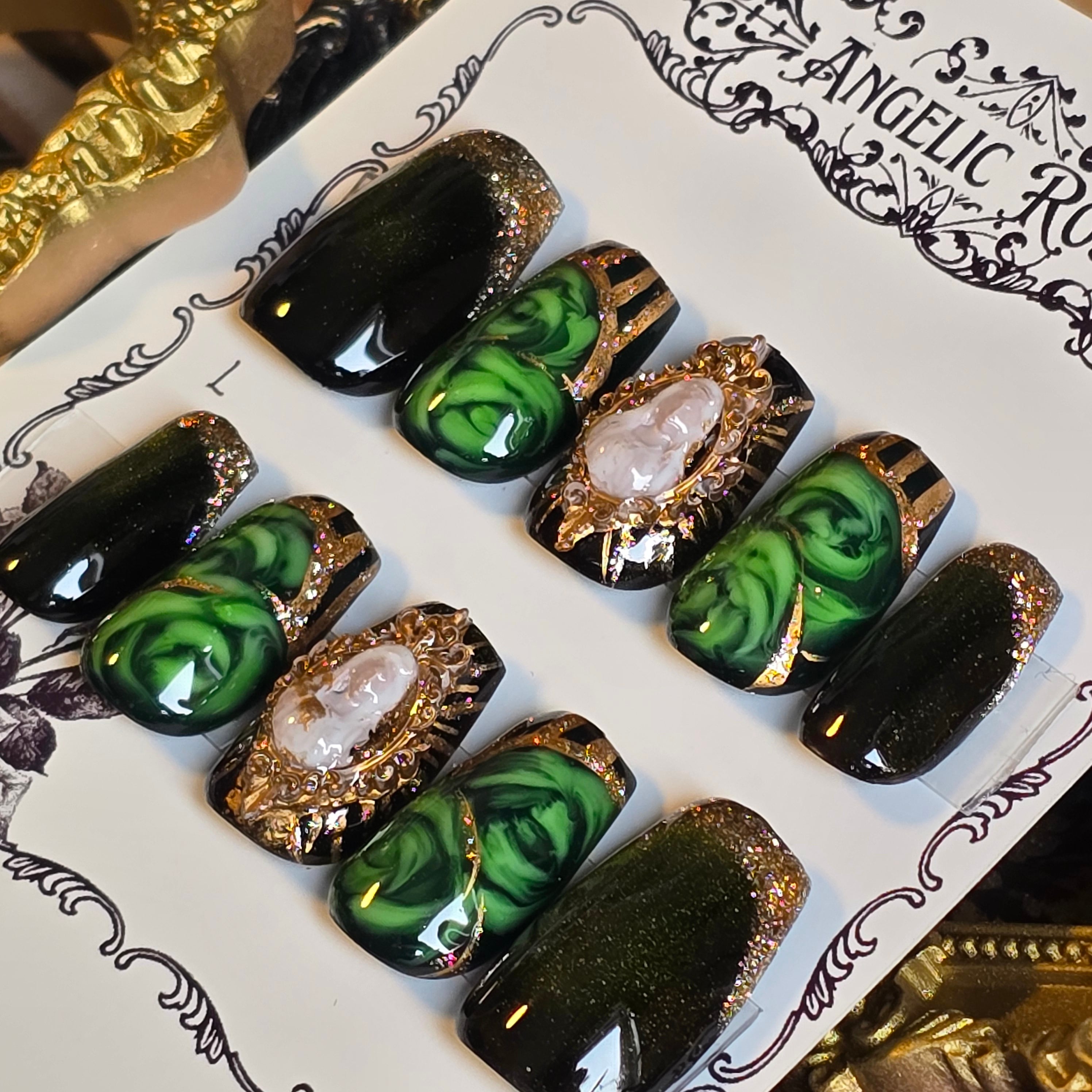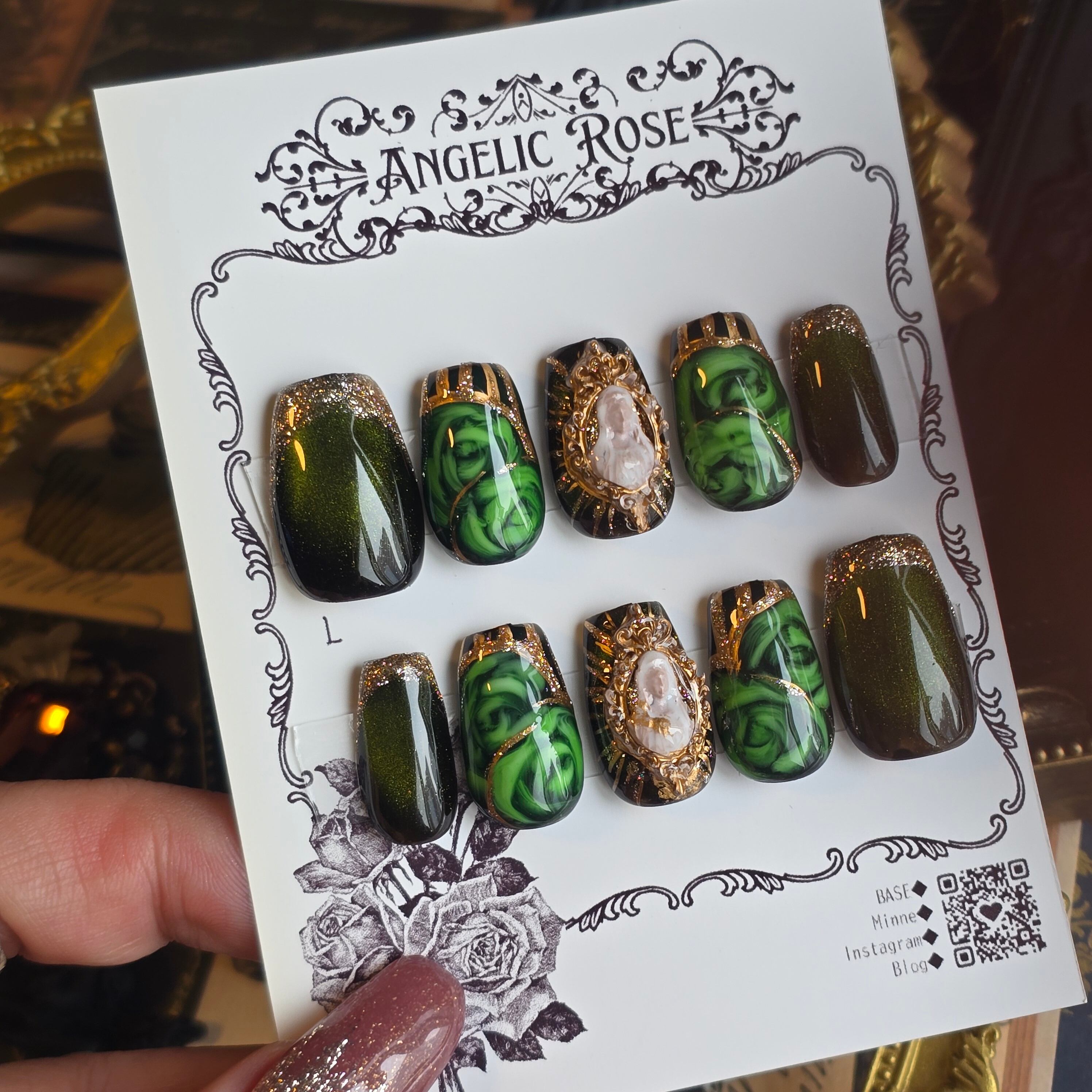 《即納》深緑の肖像~沈黙の庭~【ゴシック・バロックのアートネイルチップ/ゴシックネイル 】Mサイズ【Angelic Rose】