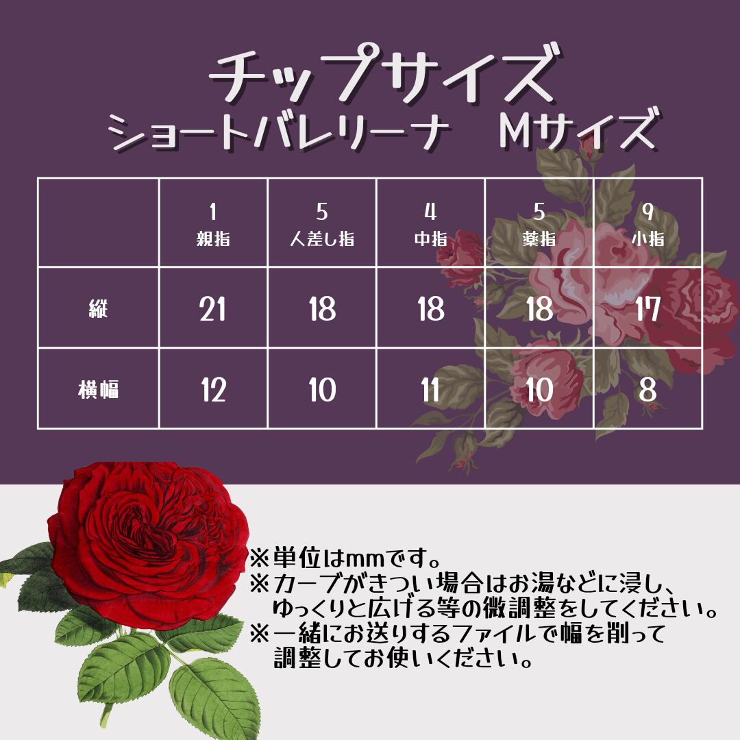 使いやすい長さのショートバレリーナタイプのチップです。